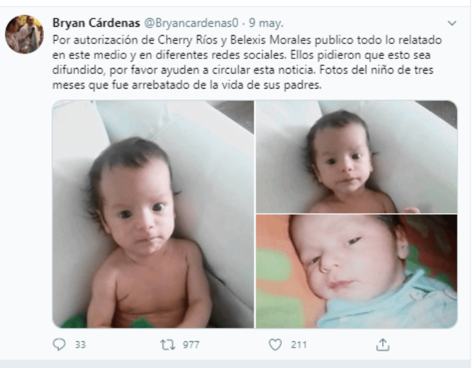 “Ellos pidieron que esto sea difundido, por favor ayuden a circular esta noticia. Fotos del niño de tres meses que fue arrebatado de la vida de sus padres”, tuiteó Cárdenas y el mensaje se replicó este sábado 9 de mayo junto a una lluvia de oraciones para que el niño volviera pronto a los brazos de sus papás.