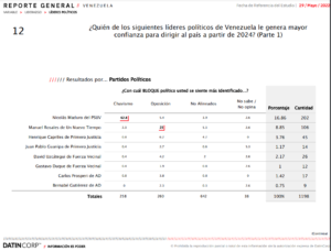 62,8% del chavismo indicó que confía en Maduro. 25% de la oposición se siente identificado con el liderazgo de Rosales, que toma amplia ventaja sobre María Corina Machado (11,5%), Henrique Capriles (6,2%), Juan Guaidó (5,4%), David Uzcátegui (4,2%), Carlos Prosperi (3,8%) y Juan Pablo Guanipa (2,7%).