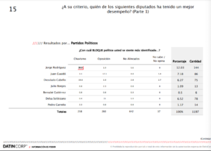 El estudio titulado Así piensan los venezolanos, realizado el 29 de mayo de 2022, señaló que Jorge Rodríguez es el diputado que mayor aceptación tiene en el chavismo. 39,9% dice que su desempeño ha sido bueno.